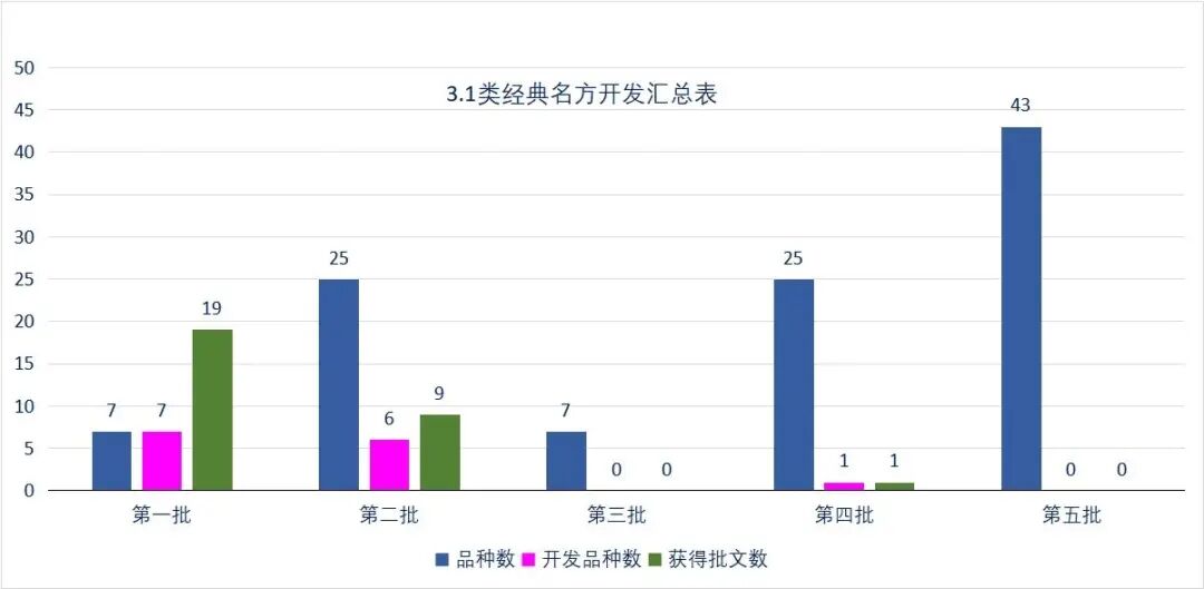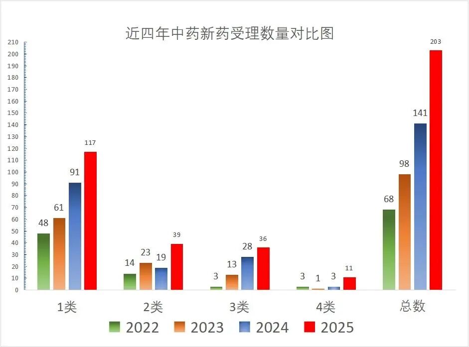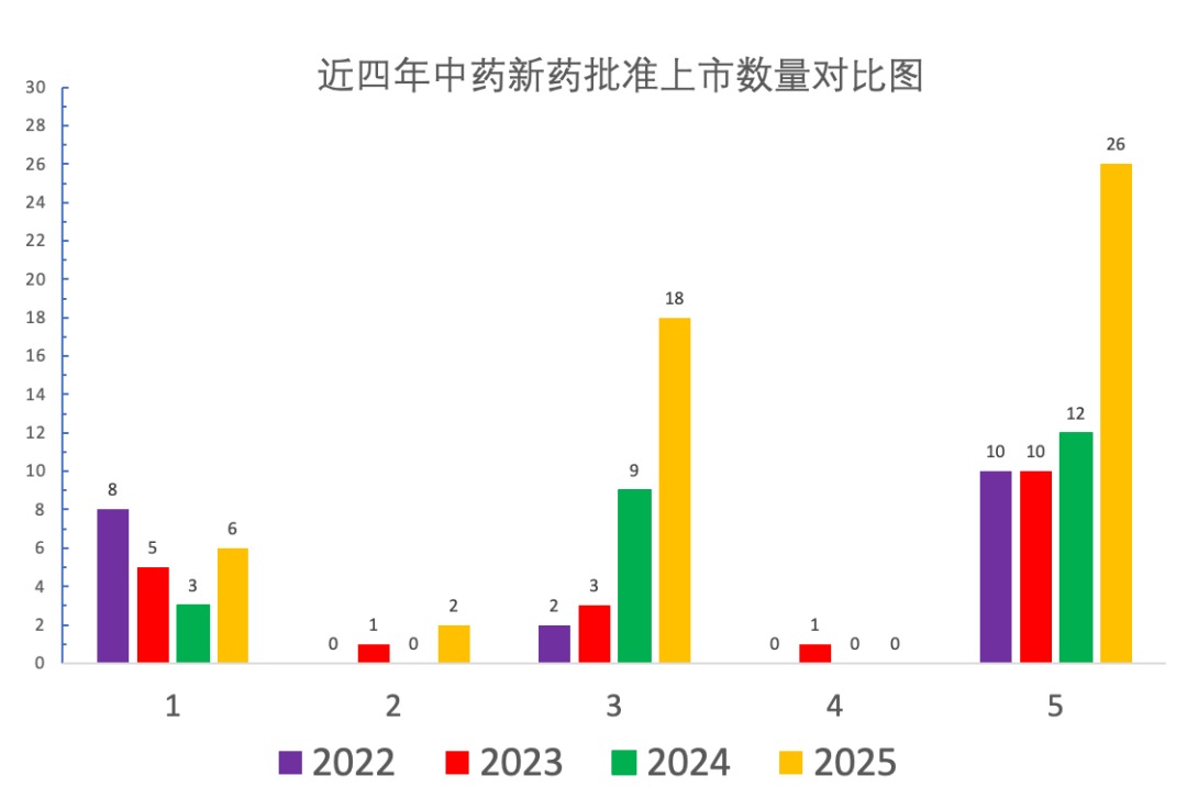 近四年一共批准中药新药(含同名同方药)61个(含3个进口):其中经典名方32个(3.1类29个、3.2类3个)、1类创新药22个、2类改良型新药3个品种、4类新药1个品种,具体数量对比表见下图。另外还批准了3个进口品种,9个港澳外用中成药内地上市注册。近四年各类中药新药(含同名同方药)审评情况见下图(未统计进口药)。从2022年以来(截至2025年12月31日)批准上市的中药创新药情况来看,以注册分类3.1类经典名方居多;其次为注册分类1.1类中药复方制剂,2类和4类获批较少,获批产品适应证领域相对集中于中医药治疗的优势领域,中药创新药通过申请加快上市程序,加快了上市速度。如桑枝总生物碱片、淫羊藿素软胶囊、小儿黄金止咳颗粒通过优先审评审批,淫羊藿素软胶囊、香雷糖足膏通过附条件批准获批上市。尤为惊喜的是2025年批准了2个代表案例2.2类品种菖麻熄风颗粒(改变剂型)和2.1类品种清喉咽含片(改变给药途径)。菖麻熄风颗粒为新版《药品注册管理办法》实施后首个免临床研究、按“符合儿童生理特征的儿童用药新品种、新剂型和规格”纳入优先审评审批的中药改良新药。该品种依托原片剂的临床积累,通过剂型改良(片剂→颗粒剂)提升儿童用药依从性,成为政策红利首个“尝鲜者”。从受理到完成核查仅用时不到3个月,仅用6个月就实现了产品的上市,这一速度背后,是政策破冰与企业创新的双重驱动。国家药监局以优先审评审批加速其上市,彰显了对“临床需求导向创新”的支持。清喉咽含片由清喉咽合剂改良而来,2023年9月获国家局受理,2025年5月获批,获批不到两年时间,该品种由胃肠道吸收改良为口腔黏膜吸收,含服直接作用在咽部,具有吸收快,起效迅速的优点,延长药物在咽喉处的滞留时间,含片日服用饮片量降低为原剂型的八分之一,为患者提供更安全可靠的治疗选择。从“量大效广 ”到“ 量小精准”,提高患者顺应性。同时,清喉咽含片被关联批准为乙类非处方药,可直接进入零售市场,为消费者提供更灵活的治疗。3.1类经典名方开发火热,但同时也存在诸多问题:(1)上市品种开发率仍偏低:2020年10月至2025年1月,先后颁布了5批古代经典名方关键信息表,包括了107个品种。截止2025年12月31日,国家药监局仅批准14个品种(29个批准文号),品种开发率为13%。(2)审评不通过率较高:自2022年1月第一个3.1类经典名方申报开始,截止2025年12月30日,国家药品审评中心累计收到80个品种申报,除部分品种仍在审评或发补中, 2025年12月31日,国家药监局仅批准14个品种(29个批准文号),批准品种仅占总数13%。分析近四年批准的中药新药(含同名同方药),可发现:1.1类新药前两年呈下降趋势,今年有所回升,3.1类经典名方整体呈上升趋势,2类和4类新批准的数量不是很多。可以说,中药新药(含同名同方药)的审批受政策影响较大,比如说新注册法规实施后三年左右,批准的1类新药还是“老品种”,也就是新法规之前立项品种。新法规实施后,1类新药申报呈井喷趋势,还主要集中在IND阶段,从中药的研发周期看,这类品种到申报生产至少还有三年以上的时间,所以2026-2028年这三年中这类品种审批上市的数量仍然较小;随着经典名方关键信息表不断地发布,3.1类品种的批准数量在2026-2028年这三年中将占据主要地位;中药4类(同名同方药)的审评政策不明朗(如是否开展临床试验),研发单位的品种立项还处于观望中。只要政策一旦明朗,这类品种的开发也将会被持有人重视起来,毕竟这类品种拥有市场开发优势;中药2类政策明朗,跟3.1类品种一样将一直是企业重点布局领域,结合中保政策,对大品种会有一定的防御功能。2020年《中药注册分类及申报资料要求》发布实施,畅通了各类中药研发路径,鼓舞了中药研发热情。中药创新药研发思路逐渐回归以临床价值为导向,更加重视临床应用有效方剂的开发,注重解决尚未满足的临床需求,多采用病证结合的研发模式,用于具有中医药治疗临床优势和符合中医药特点的适应证,在新药转化的过程中,发挥了中医药理论和人用经验的重要作用。随着支持中药传承创新相关政策的落地,中药监管科学研究的持续深入,疗效评价方法及质量控制等审评技术标准体系的不断完善和审评审批机制的持续优化,必将有更多具有临床价值的高质量中药创新药上市。