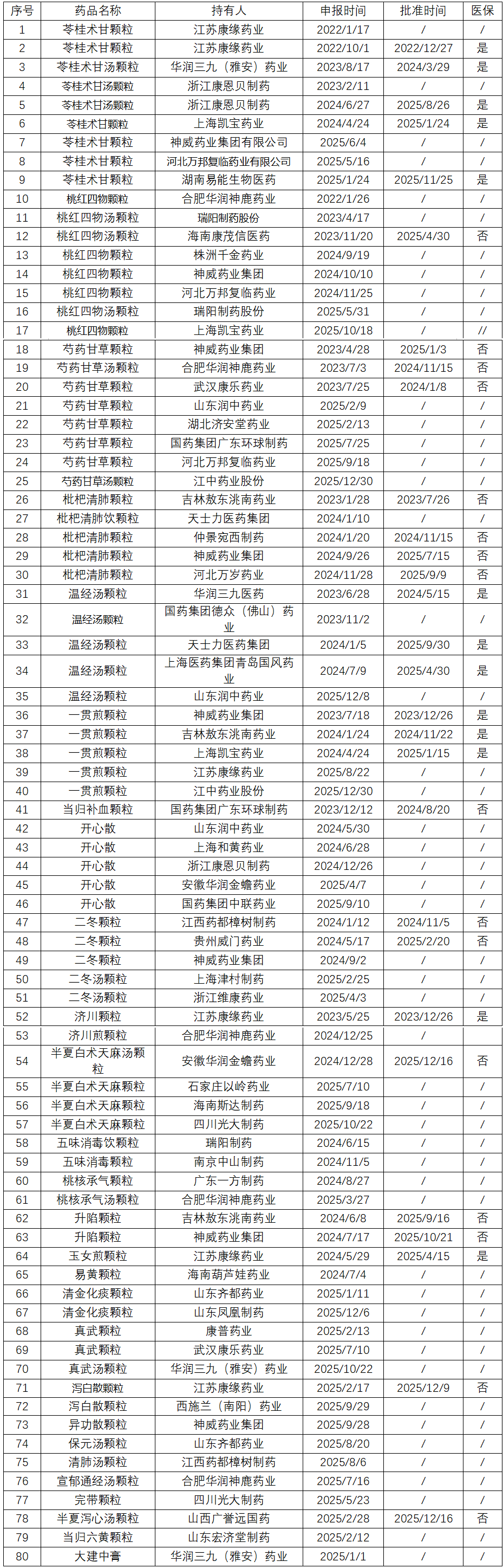 截至12月31日,近四年累计申报3.1类经典名方80项,按品种计仅有27个,开发品种数比例仅占颁布关键信息品种数(107个)四分之一,2025年新申报36项,比2024年略有提高,详细情况见下图。这其中苓桂术甘汤申报家数最多,达到了9个,其余详细情况见表1。经典名方研发渐入佳境,竞争也越来越激烈,正在研发的单位应该引起警惕了。符合本公众号文章(2022-2024年中药新药申报与审评情况汇总分析)去年预测:随着古代经典名方关键信息表目录的不断增加,该赛道的申报和批准均会不断井喷。