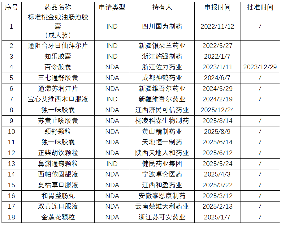 2020年《药品注册管理办法》及其配套文件《中药注册分类及申报资料要求》颁布实施,随后CDE陆续发布了《按古代经典名方目录管理的中药复方制剂药学研究技术指导原则(试行)》(2021年第36号)、《同名同方药研究技术指导原则(试行)》(2022年第48号)、《中药改良型新药研究技术指导原则(试行)》(2024年第24号)等一系列技术指导原则,2023年2月10日,国家药监局发布《中药注册专门管理规定》,全方位、系统地构建了中药注册管理体系,以上重要文件的发布为中药创新药研发带来了新的发展机遇。本文对2022-2025年四年来中药新药申报与批准汇总分析,为研究者开发中药新药提供参考。